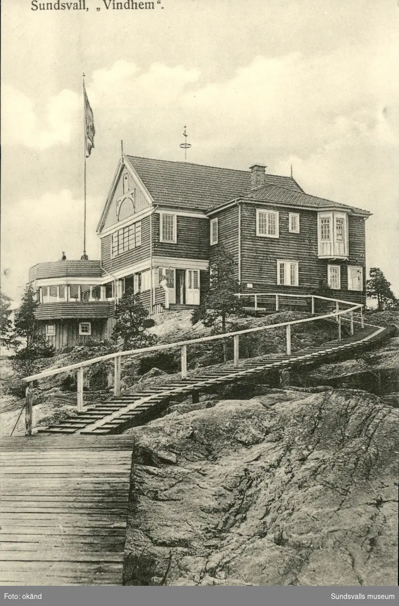 Vykort med motiv över Vindhem, segelsällskapets klubbhus i Sundsvall. Uppfört 1911.