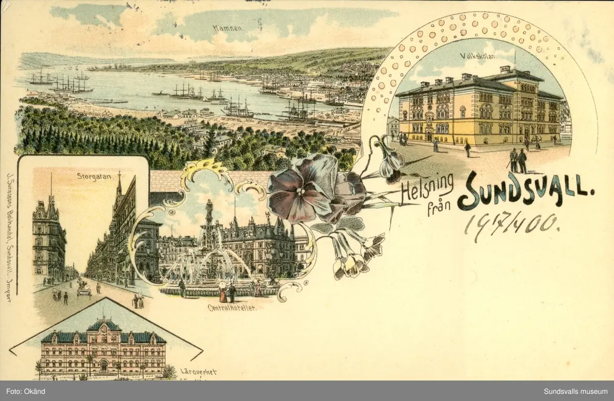 Vykort med motiv över Hamnen, Folkskolan, Storgatan, Centralhotellet och Läroverket för flickor i Sundsvall.