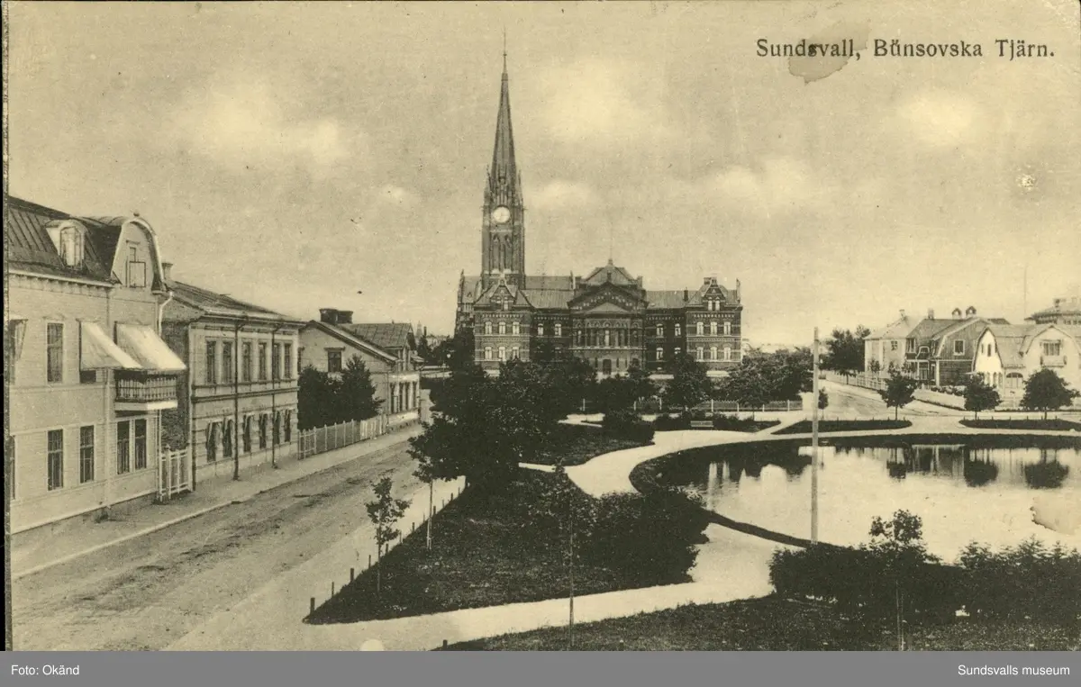 Vykort med motiv över Bünsowskatjärnen med Gustav Adolfs kyrka i bakgrunden.