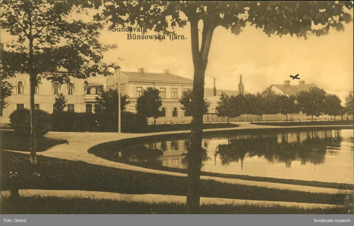 Titel: Vykort med motiv över Bünsowska tjärnen i Sundsvall.