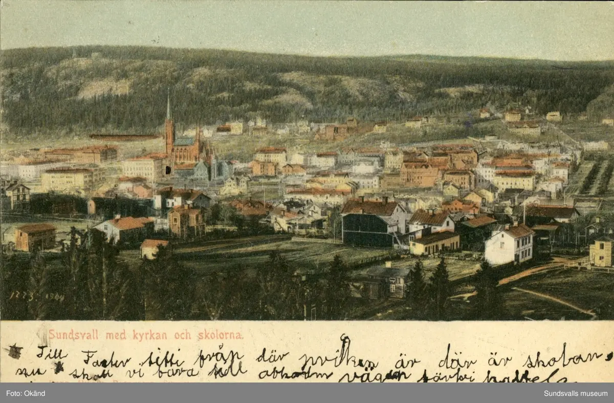 Titel: Vykort med motiv över Sundsvall och Gustav Adolfs kyrka.