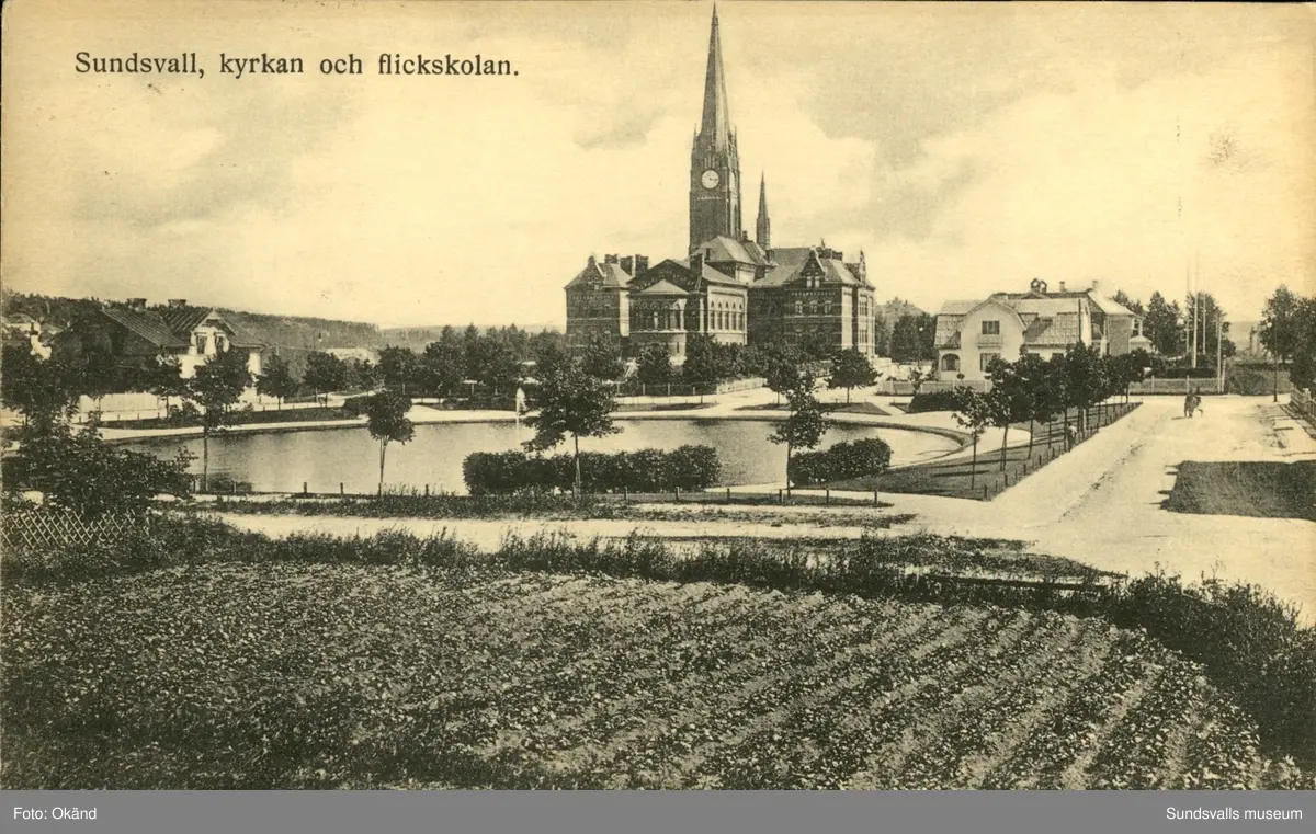 Vykort med motiv över Bünsowska tjärnen, Gustav Adolfs kyrka och Flickskolan.