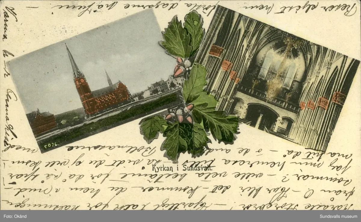 Vykort med motiv av Gustav Adolfs kyrka, exteriört och interiört.