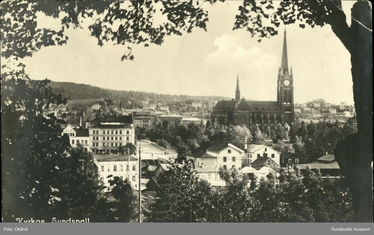 Vykort med motiv över parti av Sundsvall och Gustav Adolfs kyrka.