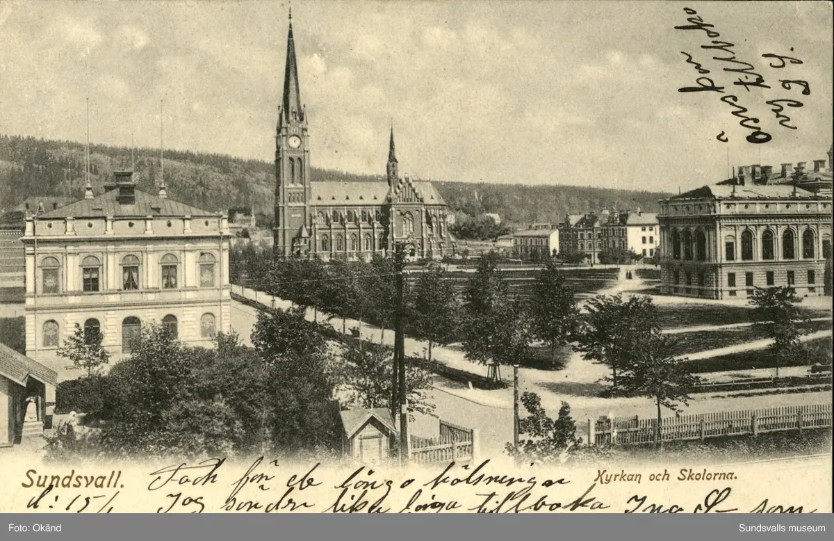 Vykort med motiv över Gustav Adolfs kyrka och skolorna.