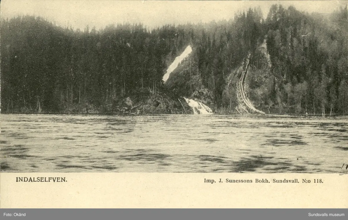 Vykort med motiv över en flottningsränna vid Indalsälven.