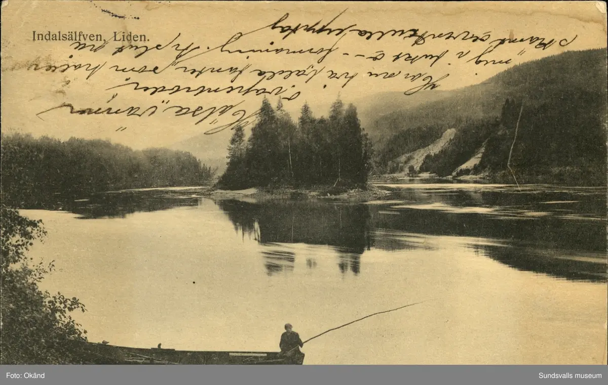 Titel: Vykort med motiv över Indalsälven vid Liden.