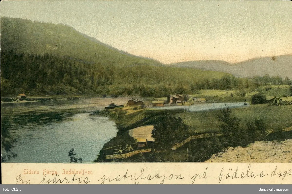 Titel: Vykort med motiv över Lidens färja som trafikerade Indalsälven.