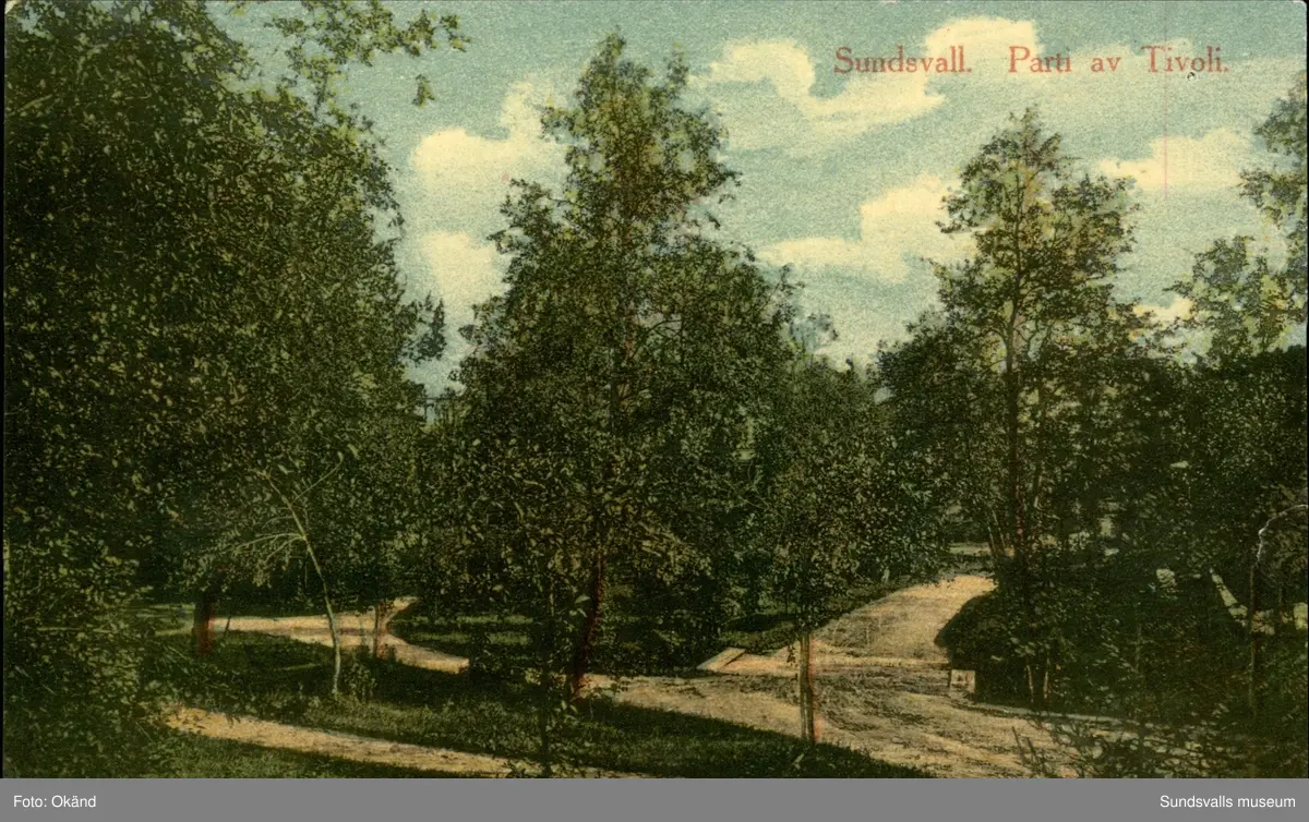 Vykort med motiv över parken vid Tivoli i Sundsvall.