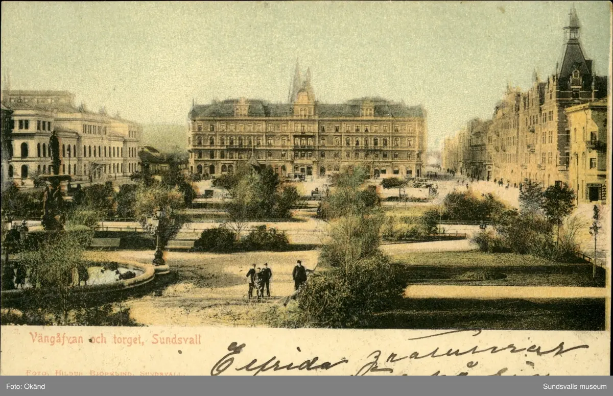 Vykort med motiv över Vängåvan och Stora torget i Sundsvall.
