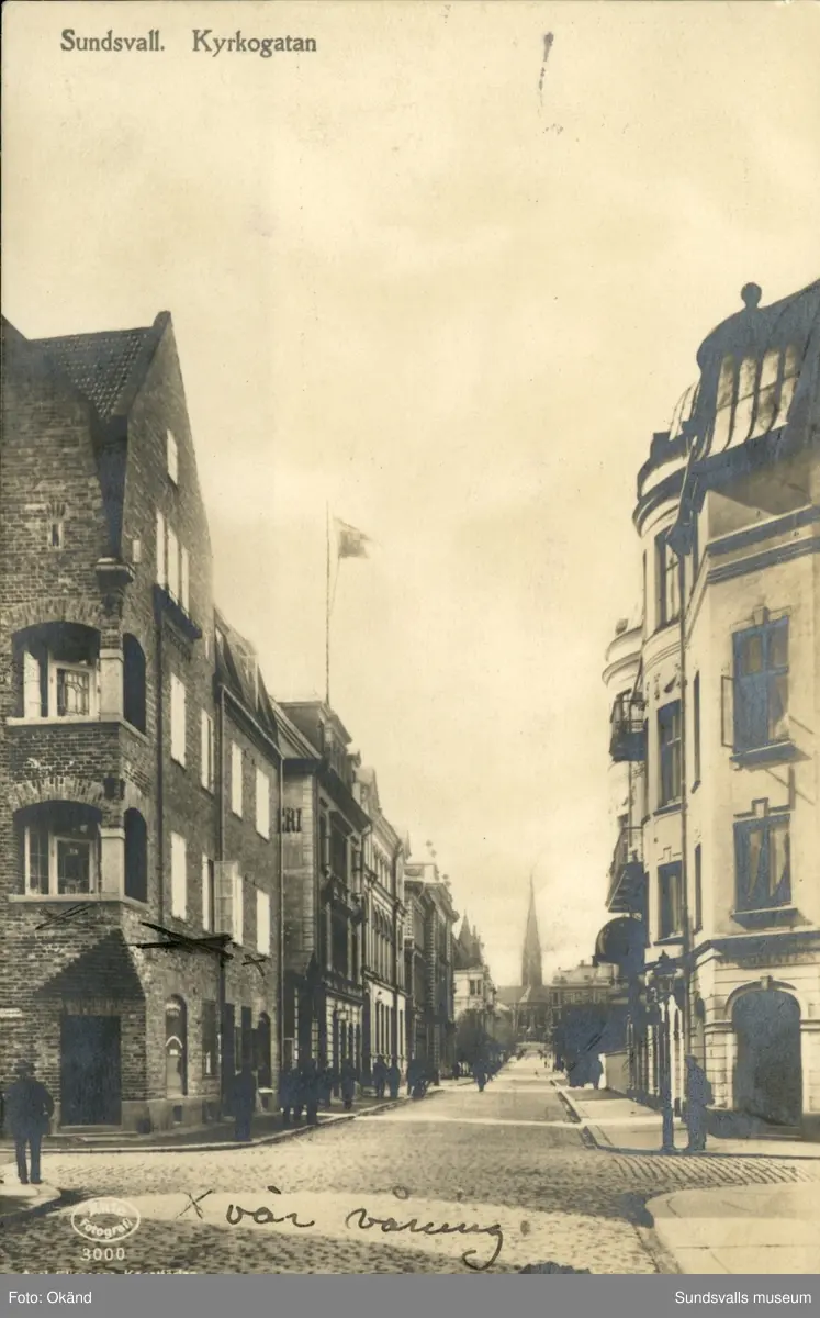Vykort med motiv över Kyrkogatan i Sundsvall.