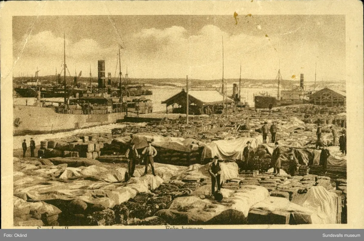 Vykort med motiv över arbetet i hamnen i Sundsvall.
