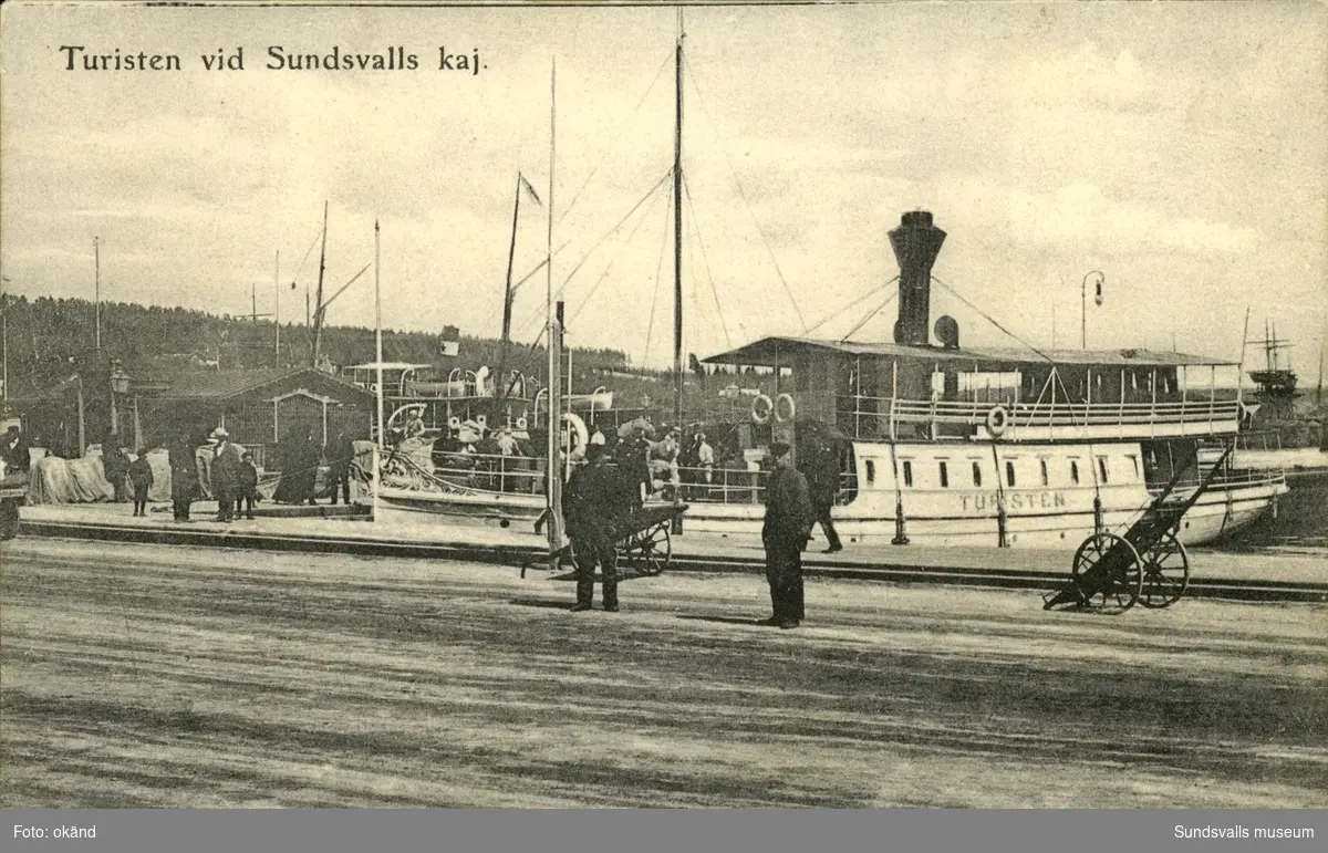 Vykort med motiv över hamnen och passagerartrafiken i Sundsvall.