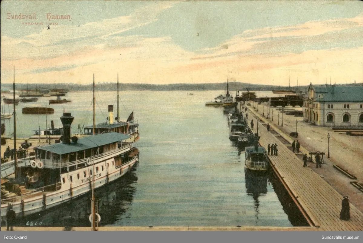 Vykort med motiv över hamnen och passagerartrafiken i Sundsvall.