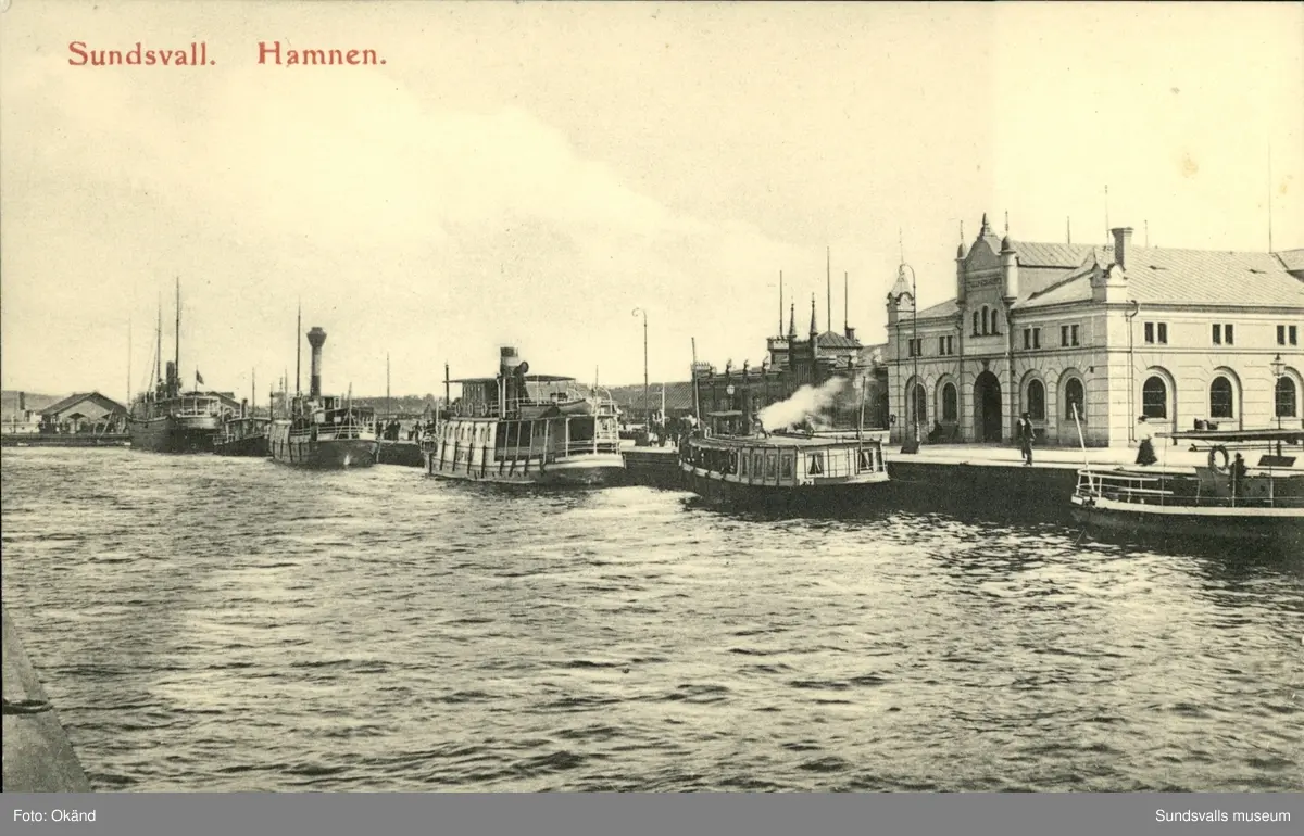 Vykort med motiv över hamnen och passagerartrafiken i Sundsvall.