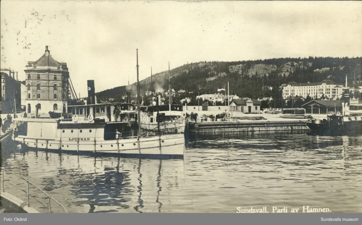 Vykort med motiv över passagerarbåtar vid hamnen i Sundsvall.