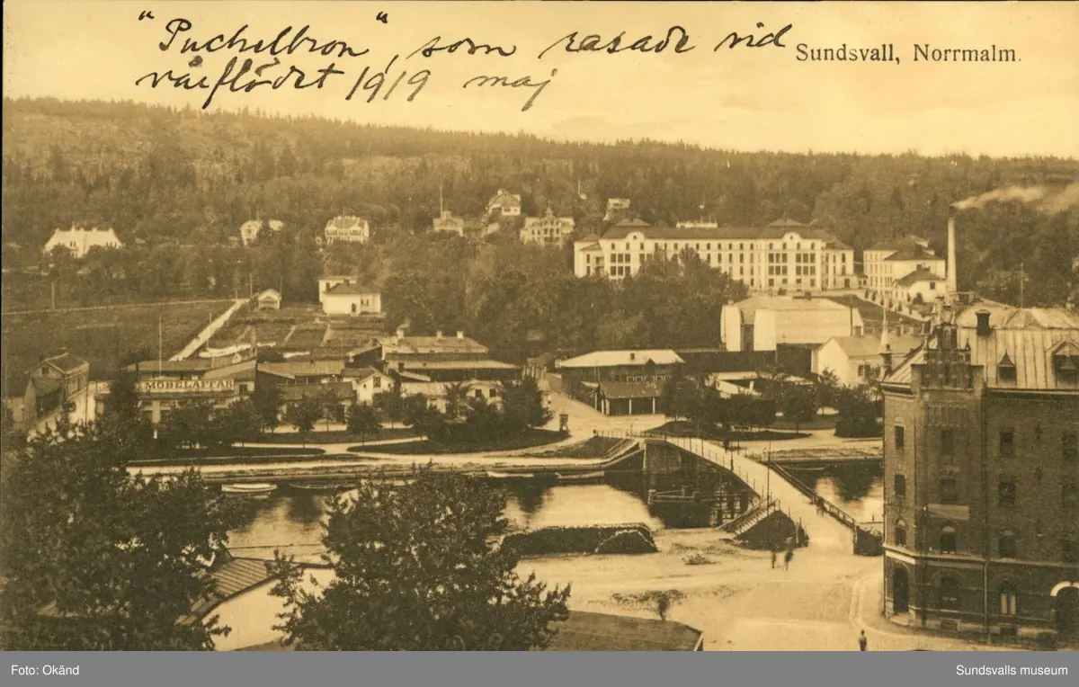 Vykort med motiv över Selångersån och bron till Norrmalm.