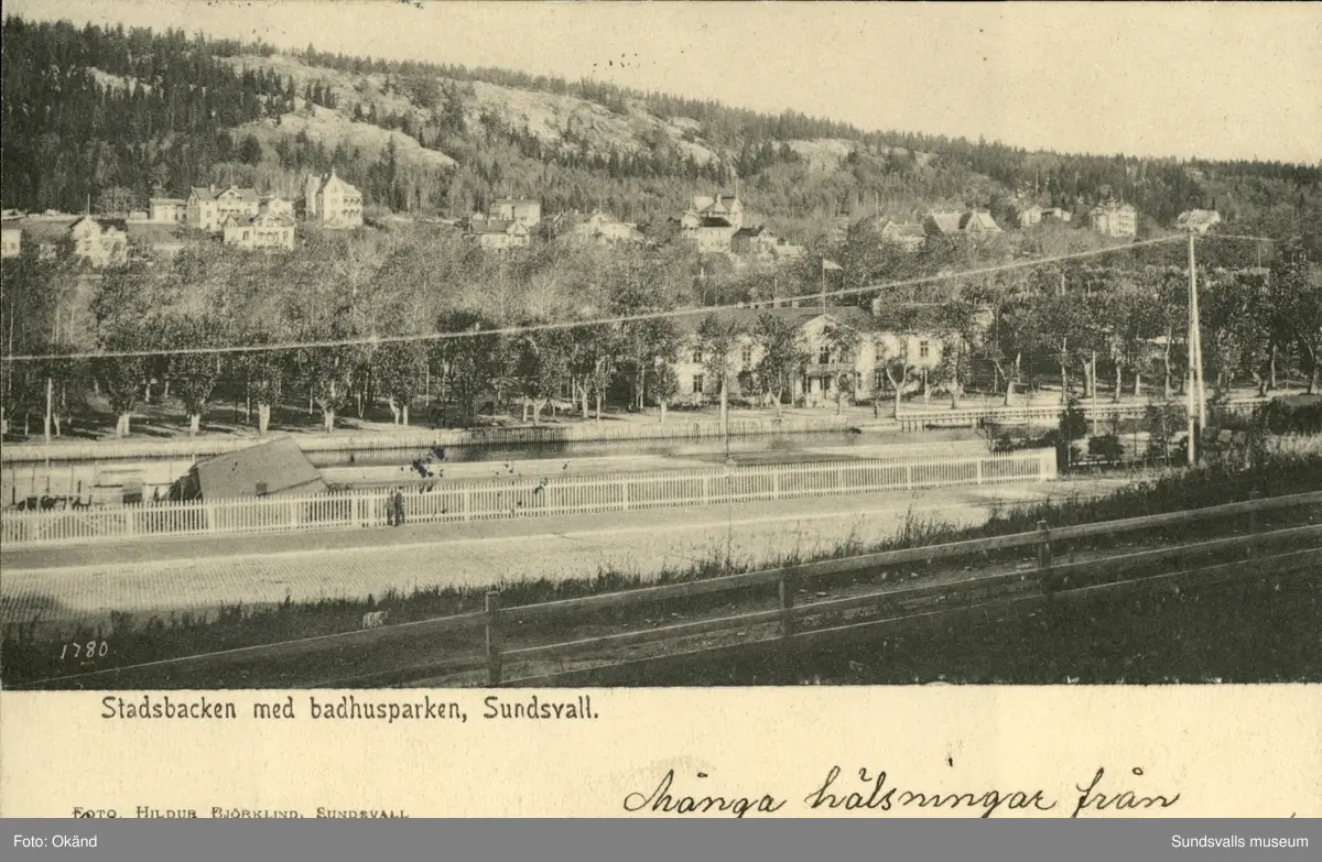 Vykort med motiv över Stadsbacken och Badhusparken i Sundsvall.