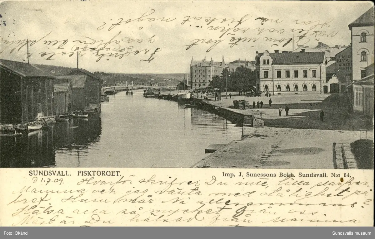Vykort med motiv över Fisktorget och Selångersån i Sundsvall.