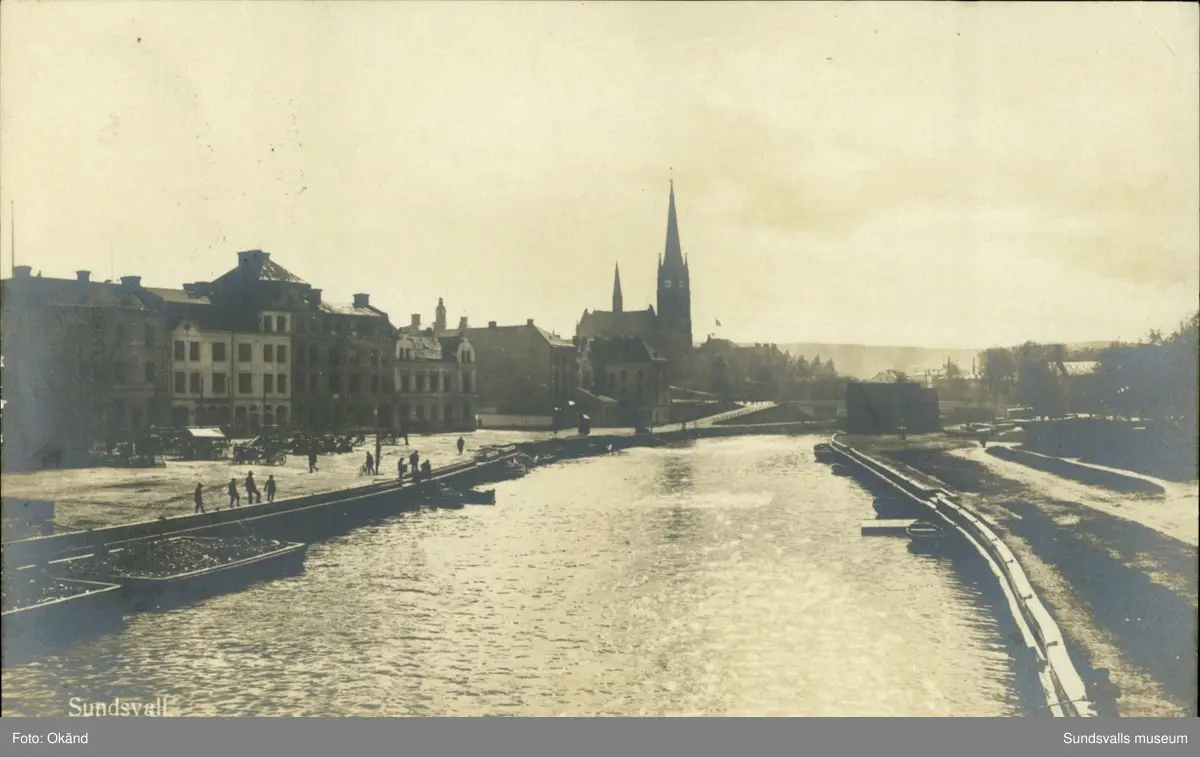 Vykort med motiv över Selångersån med Gustav Adolfs kyrka i bakgrunden.