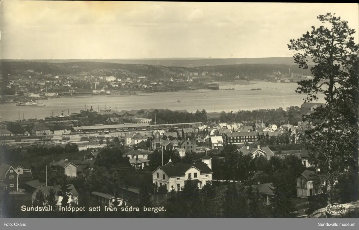 Vykort med motiv över inloppet till hamnen i Sundsvall sett från Södra Stadsberget.