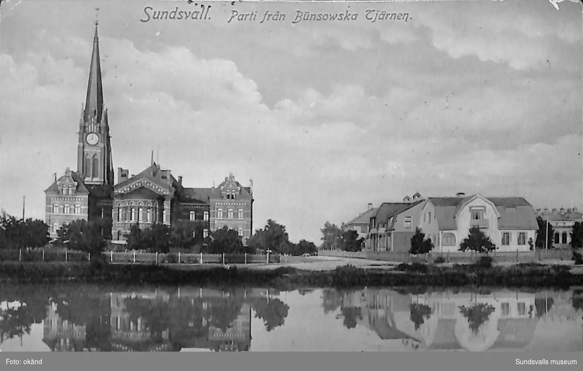 Vykort med motiv över Bünsowska tjärnen och Gustav Adolfs kyrka i bakgrunden.