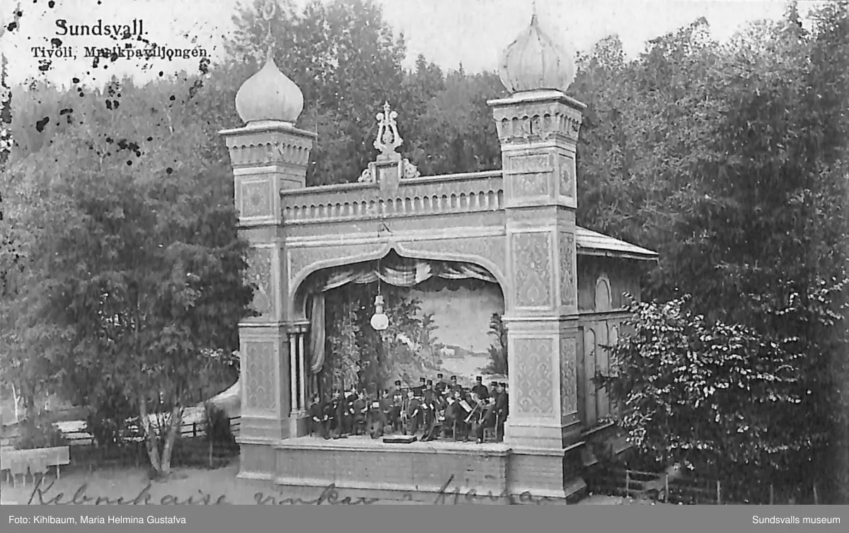 Vykort med motiv över musikpaviljongen på Tivoli i Sundsvall.