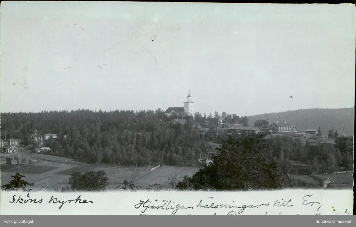Vykort med motiv över Sköns kyrka utanför Sundsvall.