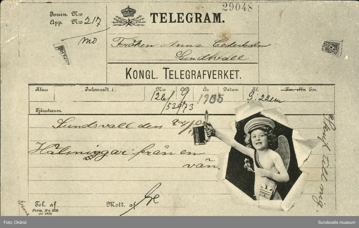 Vykort med motiv utformat likt ett telegram.