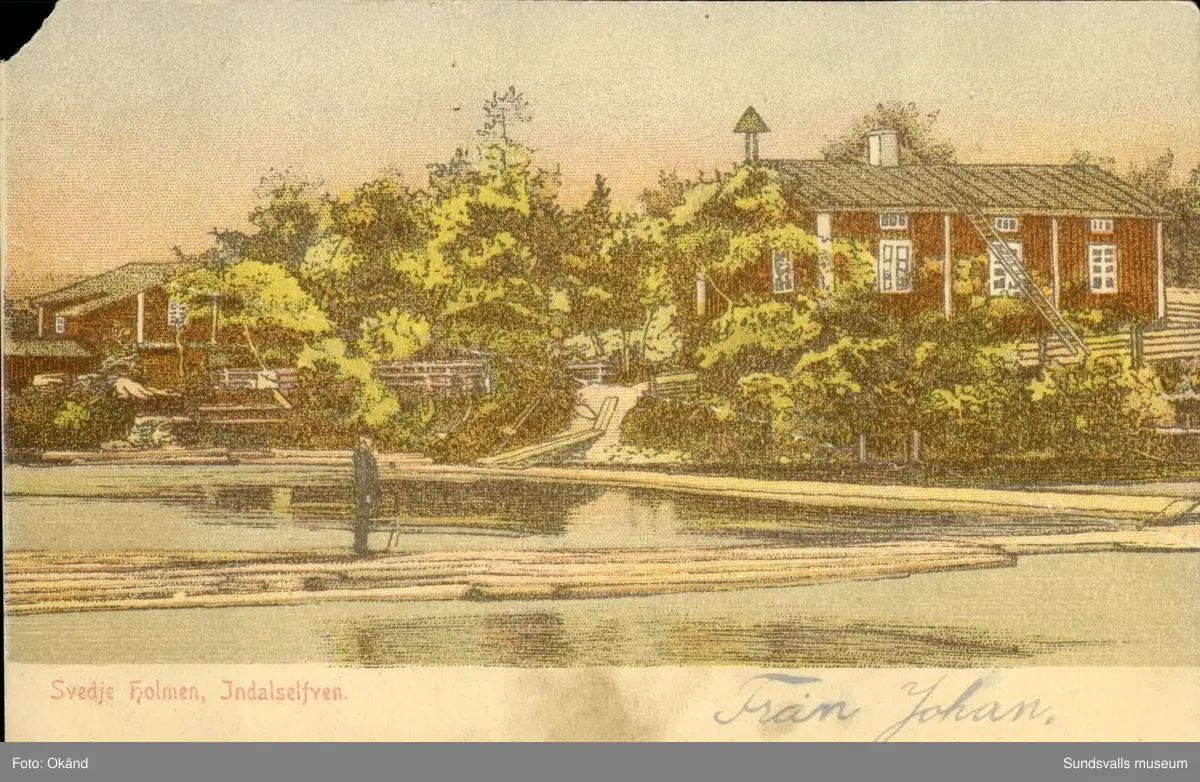 Vykort med motiv över Svedjeholmen i Indalsälven.