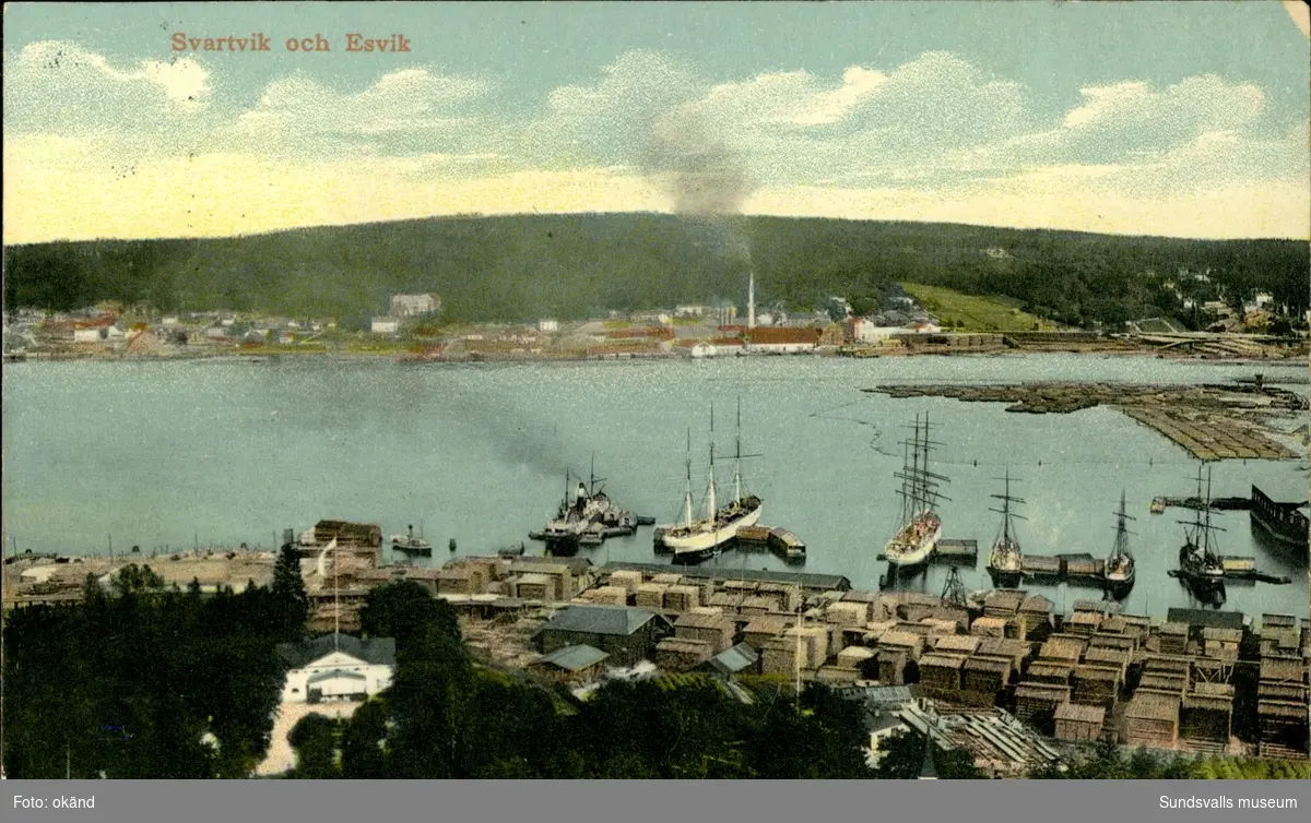Vykort med motiv över Svartvik och Essviks träindustrier.