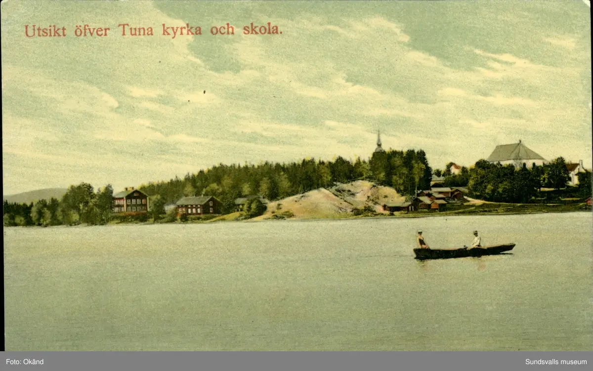 Vykort med motiv över Tuna kyrka och skola i Matfors utanför Sundsvall.