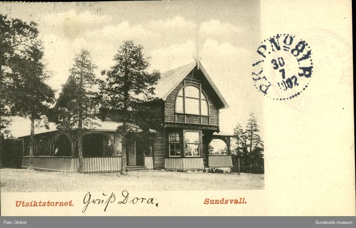 Vykort med motiv över Utsiktstornet och Turistpaviljongen i Sundsvall.
