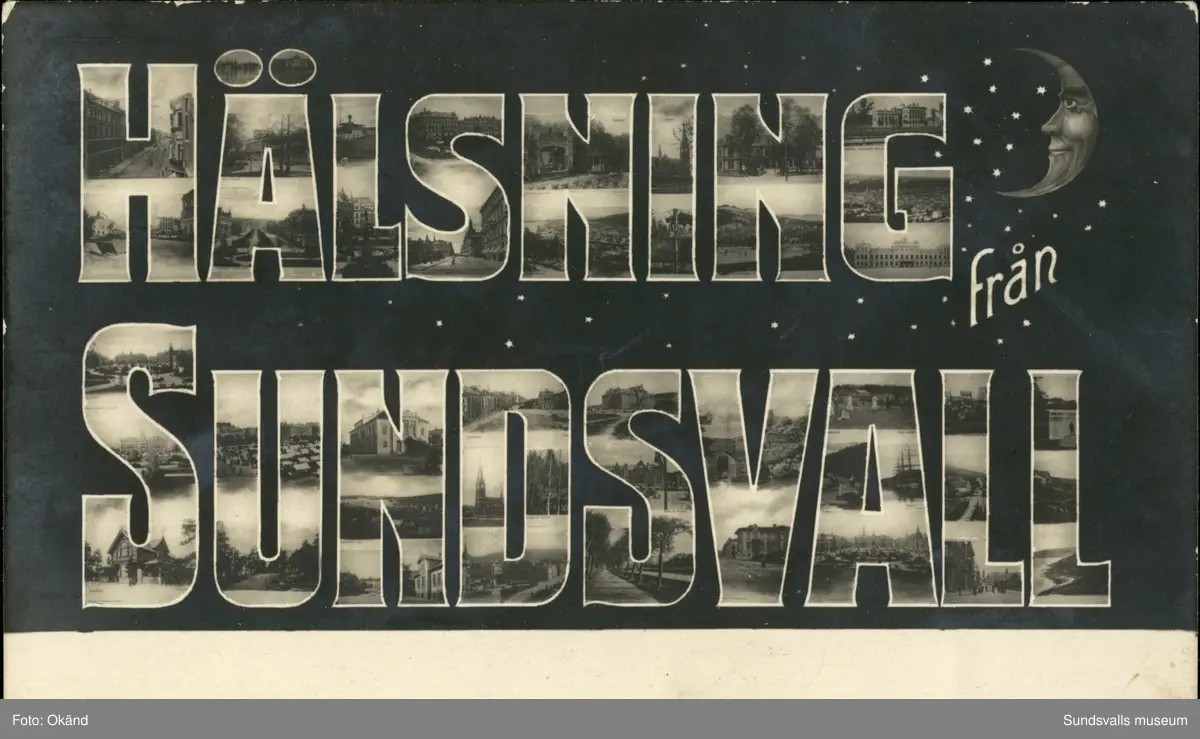 Vykort med texten: Hälsning från Sundsvall i vilken det finns topografiska bilder över staden.
