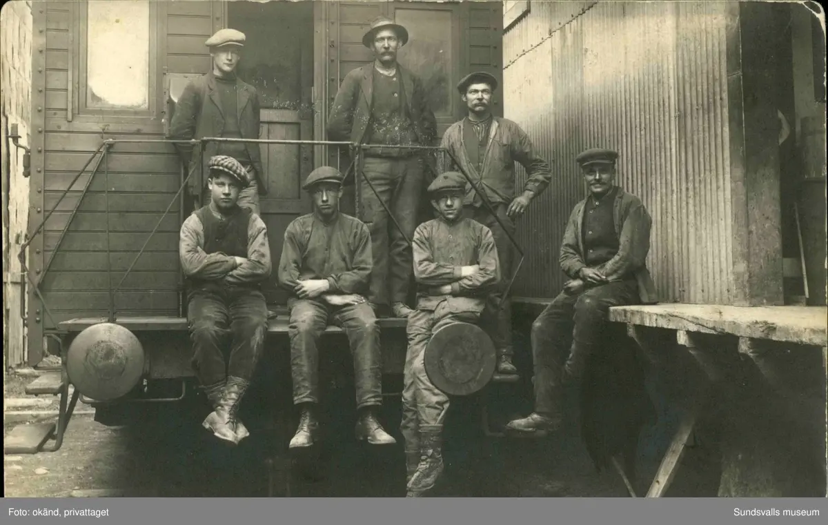 Vykort med motiv av banarbetare på en järnvägsvagn i Alby.