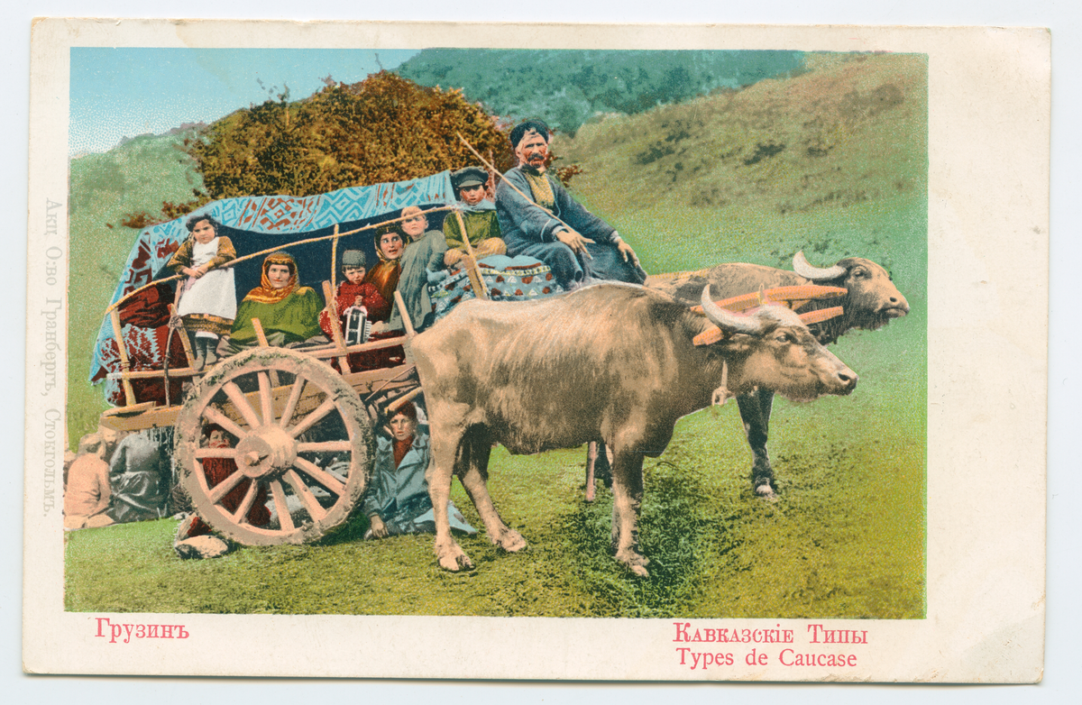 På kuvertet står följande information sammanställd vid museets första genomgång av materialet: Bufflar drar vagn med Kaukasier.
