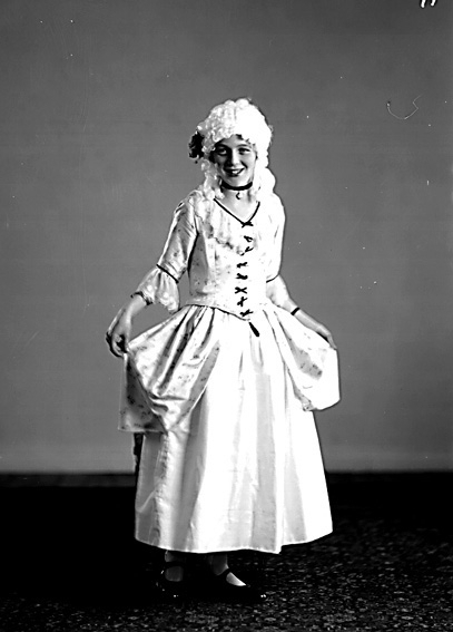 Flicka i klänning och peruk.