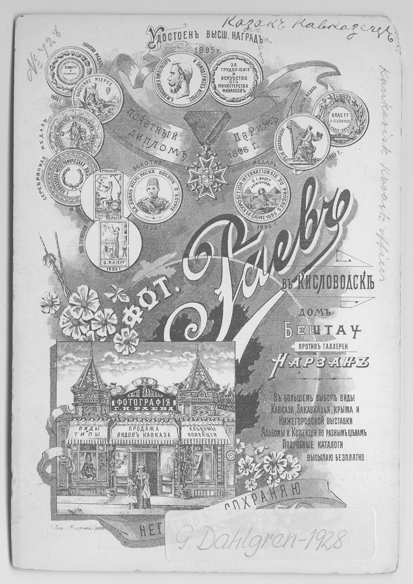På kuvertet står följande information sammanställd vid museets första genomgång av materialet: Kaukasien. Kaukasisk Kosack officer.