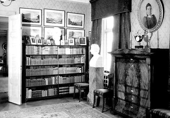 Chiffonjè, bokhylla, byst och stolar i hemmiljö.
