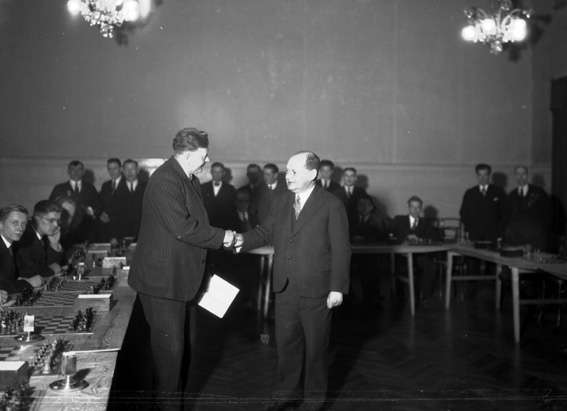 Två män i förgrunden som skakar hand, i bakgrunden står och sitter det människor. På borden står det schackbrickor.