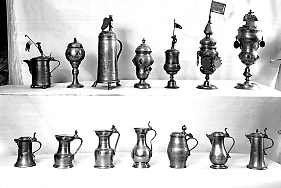 Två hyllor med 14 olika kannor.