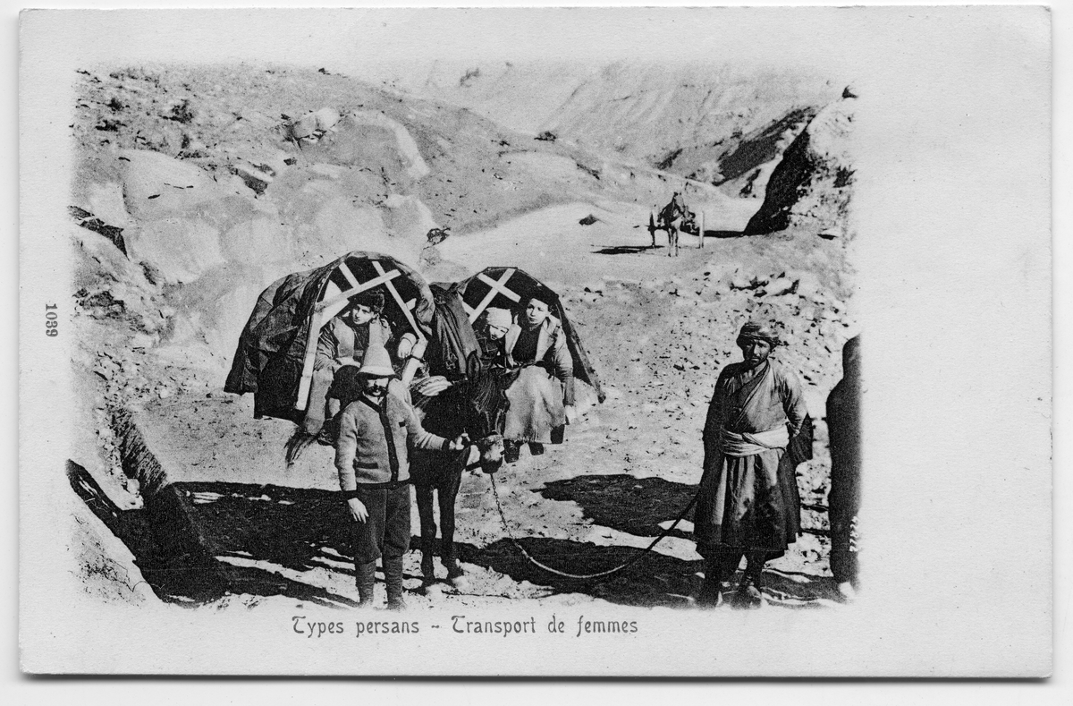 På kuvertet står följande information sammanställd vid museets första genomgång av materialet: Persien. Berg, Gr. bild. Transporteras på åsna.