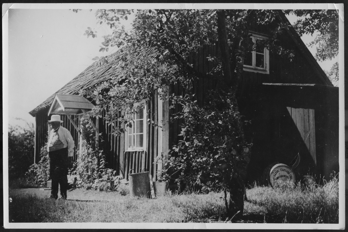 På kuvertet står följande information sammanställd vid museets första genomgång av materialet: Man framför Fia stugan.