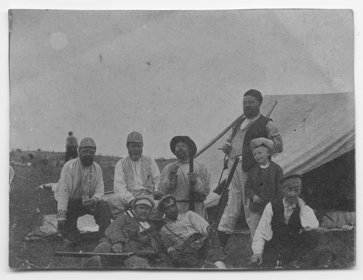 På kuvertet står följande information sammanställd vid museets första genomgång av materialet: gr.bild. Beväpnande män.