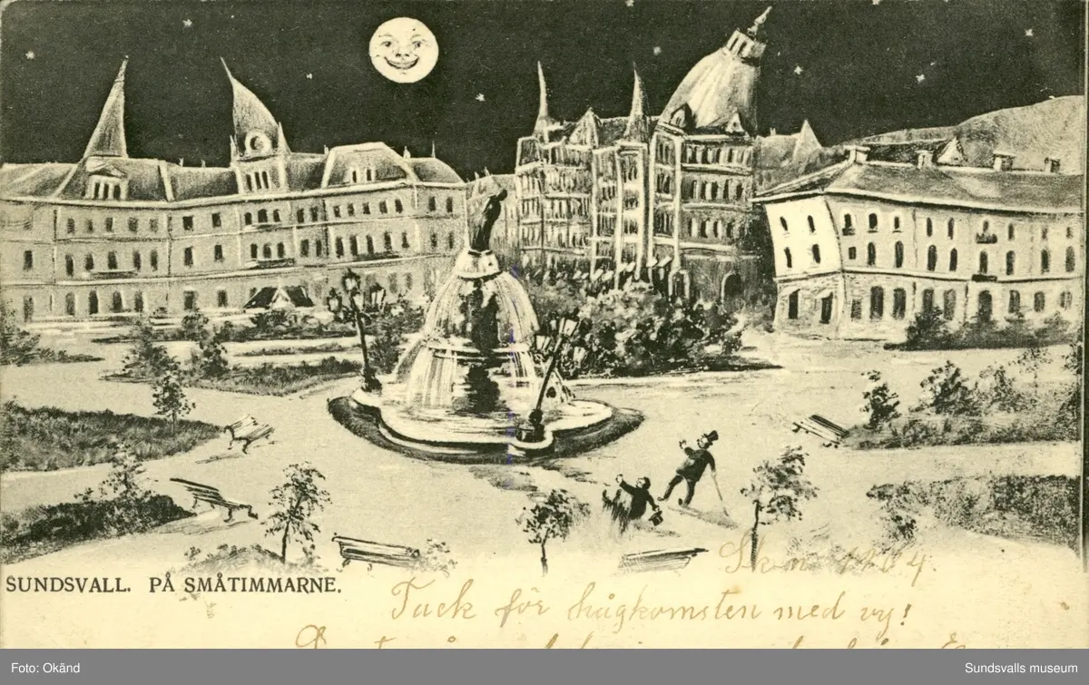 Vykort över Vängåvan i Sundsvall framåt småtimmarna.