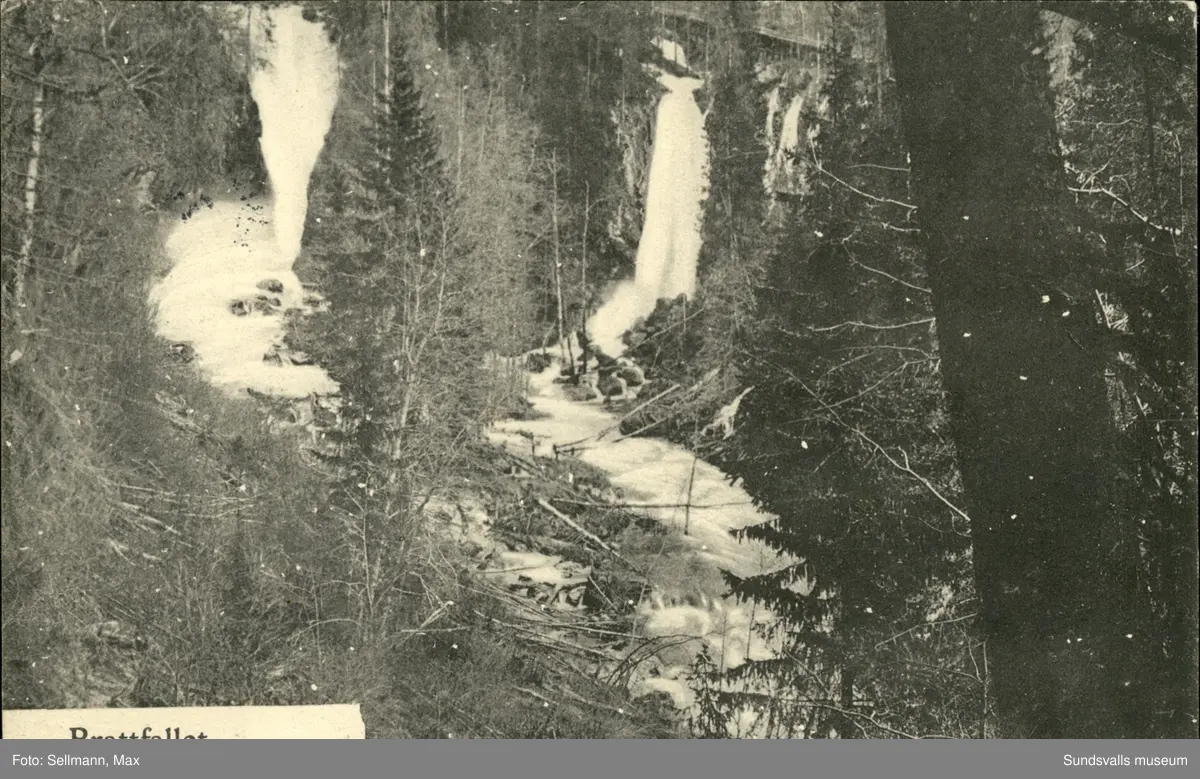 Vykort med motiv över Brattfallet vid Oxsjön i liden. Vykortet bär texten 15 minuters gång från båten.