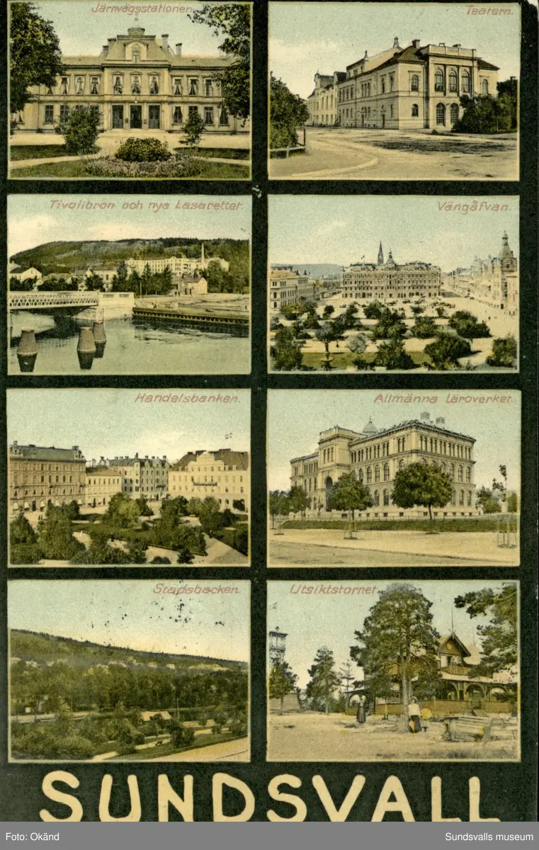 Vykort med motiv över Järnvägsstationen, Teatern, Tivolibron och Nya lasarettet, Vängåvan, Handelsbanken, Allmänna läroverket, Stadsbacken och Utsiktstornet i Sundsvall.