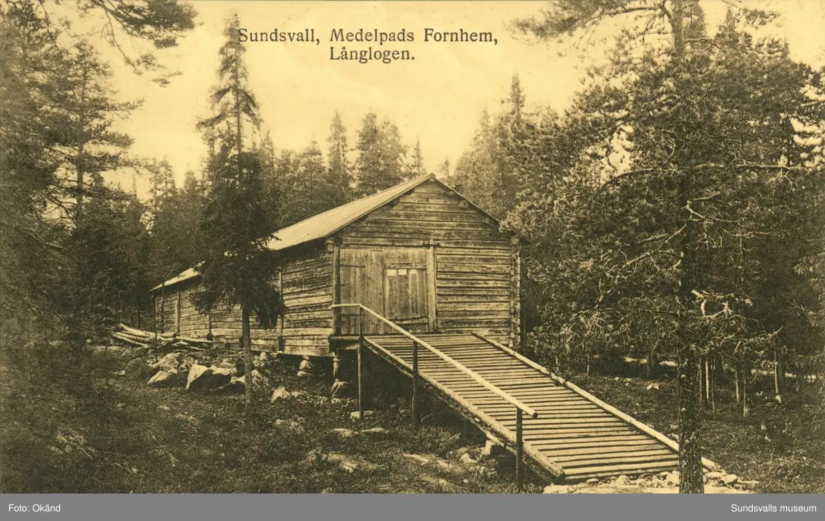 Vykort med motiv över Medelpads fornhem på Norra Stadsberget i Sundsvall med texten: Långlogen.
