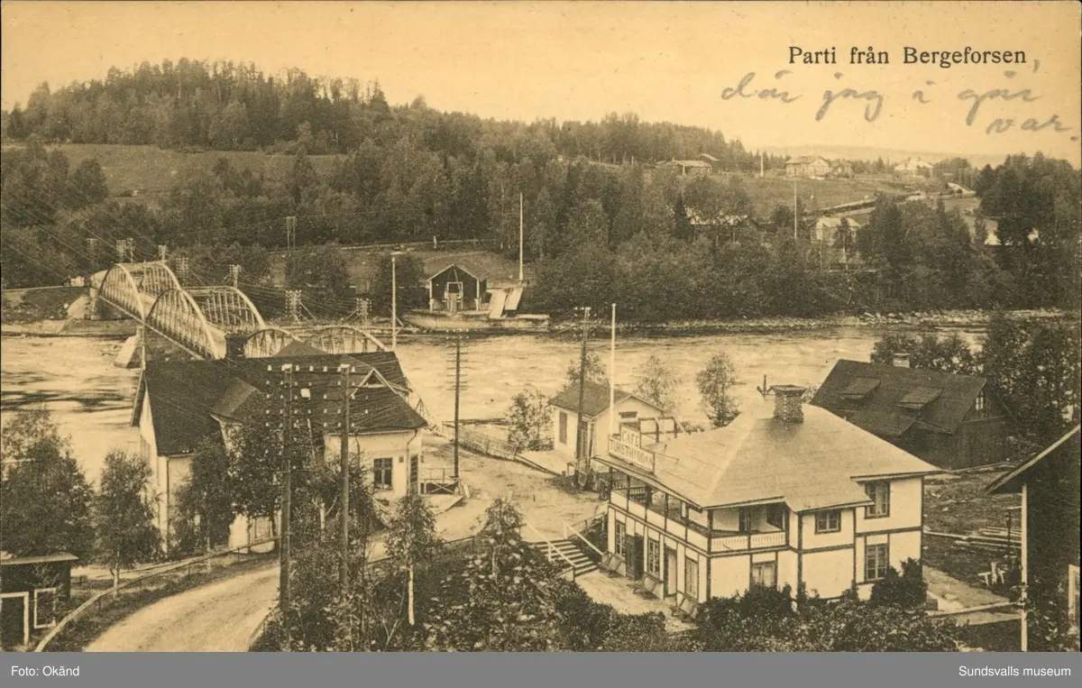 Vykort med motiv taget från södra sidan om Indalsälven vid Bergeforsen. Café Turisthyddan ses till höger.