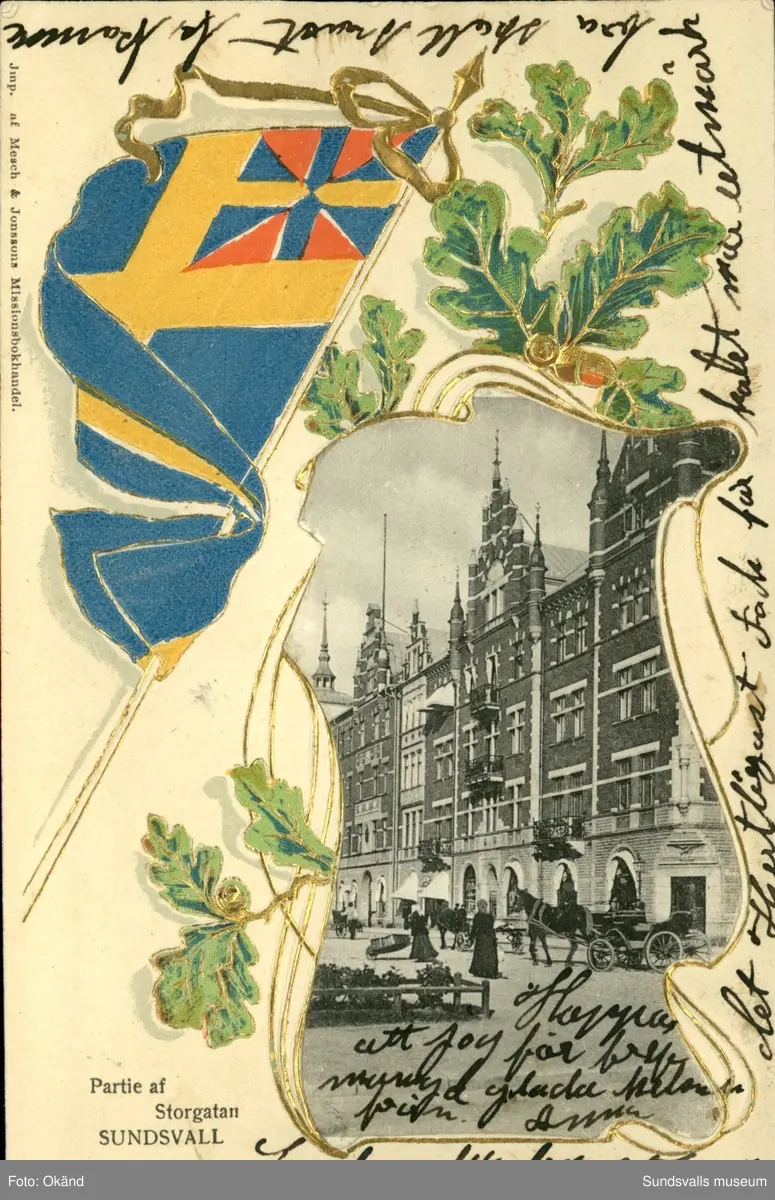 Vykort med bild över parti av Storgatan, det vänstra övre hörnet har utsmyckats med unionsflaggan.
